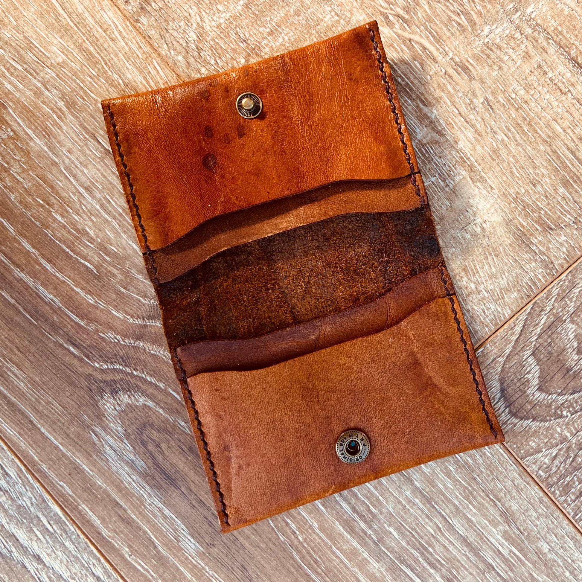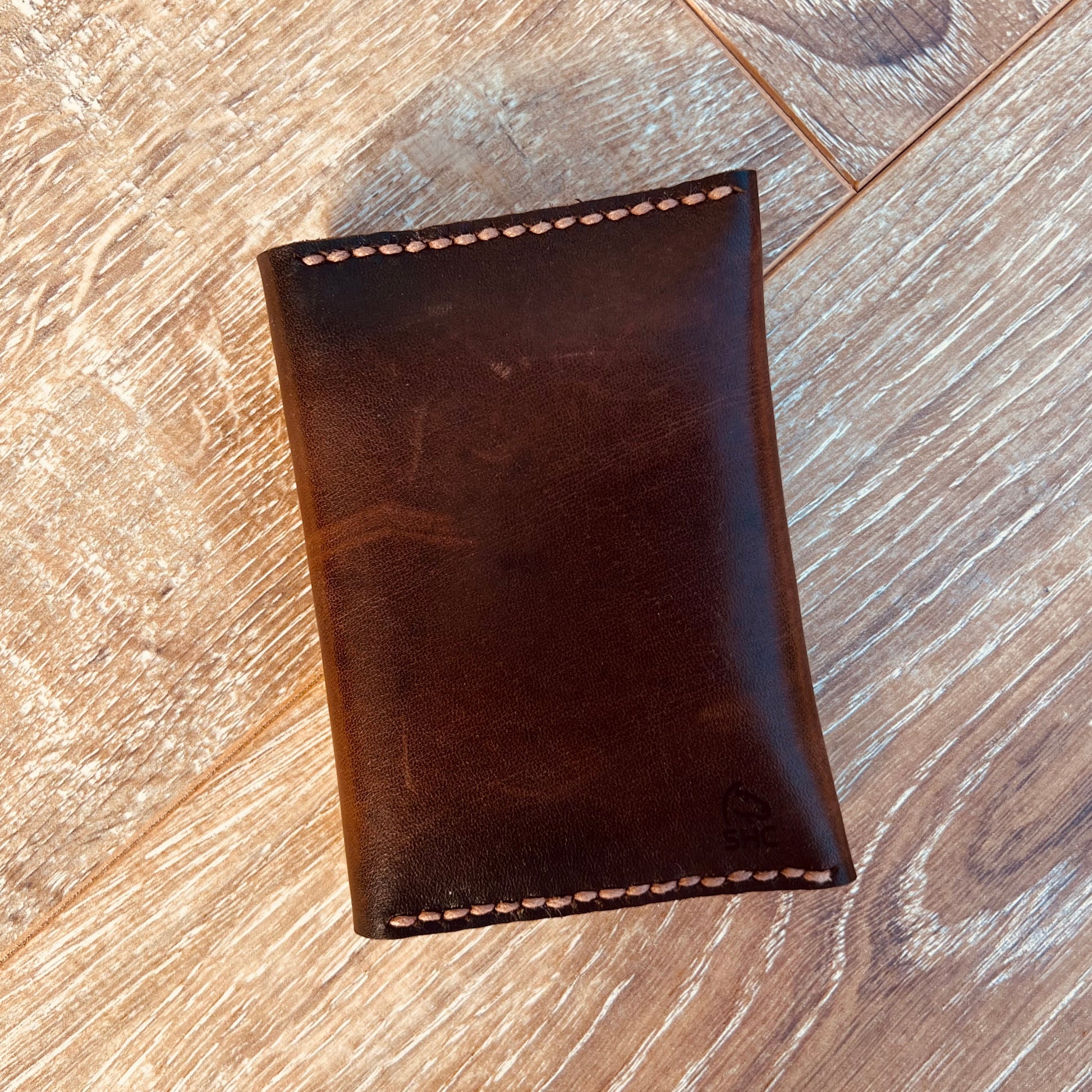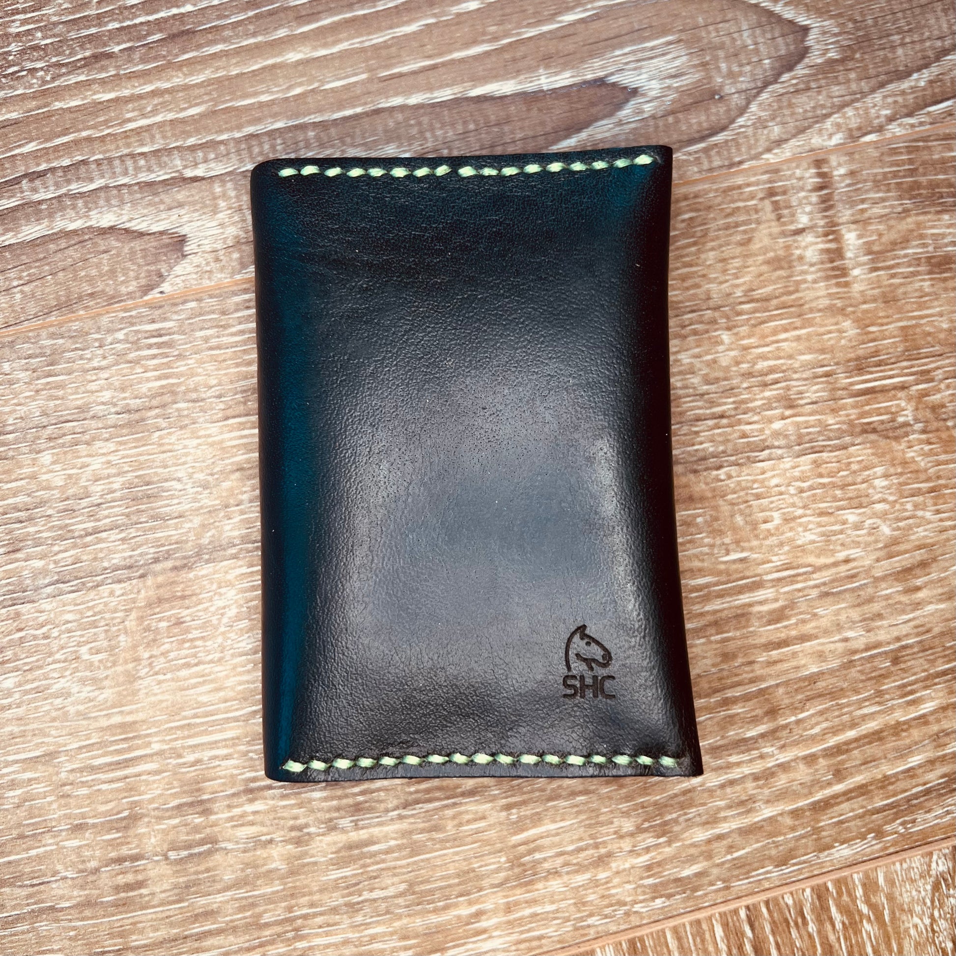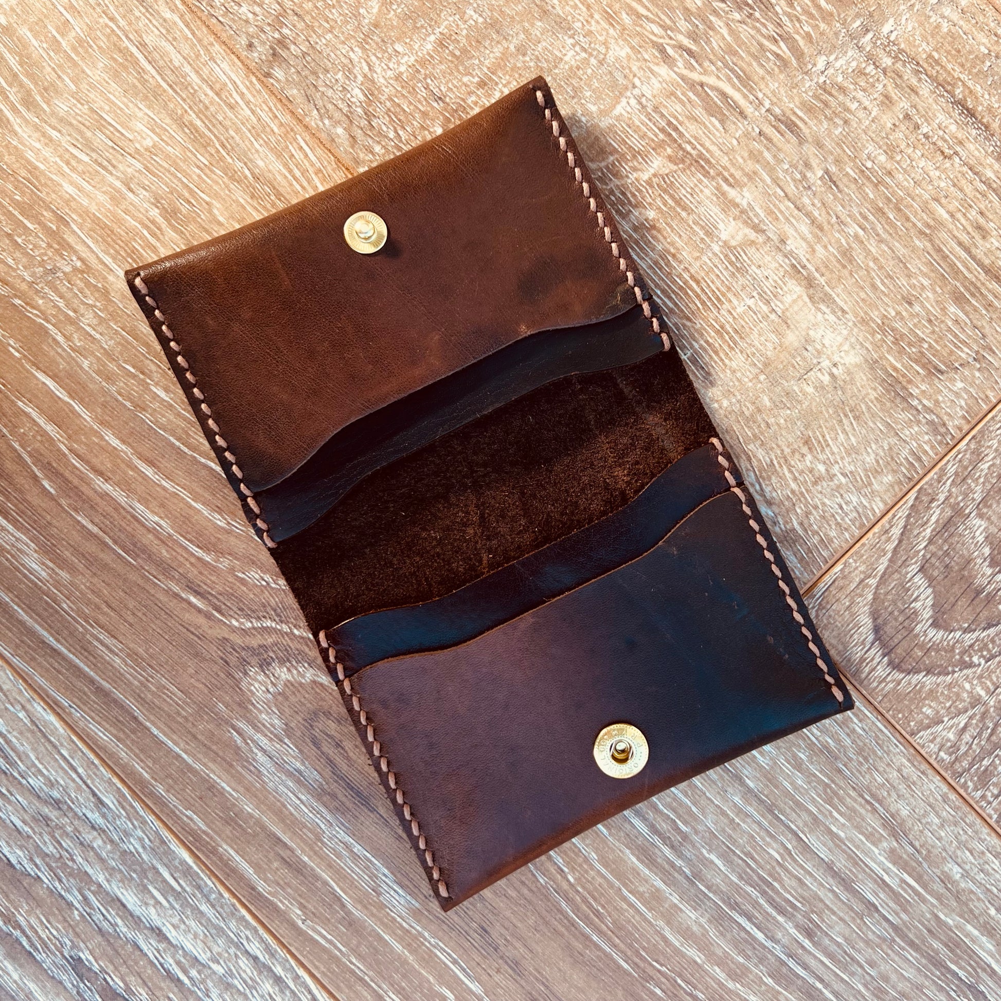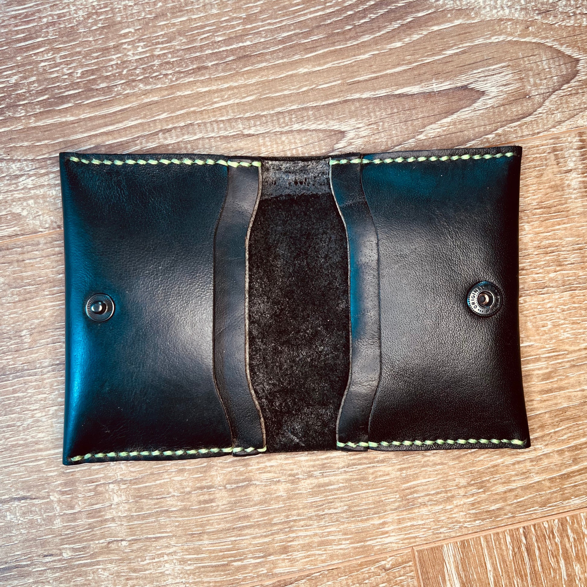 At least 8 cards and/or banknotes, ID cards, etc. fit easily into the case. The compartments are generously sized so that each compartment has space for at least 2 cards. The case is closed with a high-quality snap fastener from the German brand "Prym". The seams are made of waxed saddle thread, which is extremely durable. The cognac-colored case has dark brown seams, the dark brown case has beige seams, and the black case has neon yellow seams.